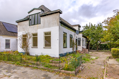 Indeling: Hal, meterkast, in verbouw zijnde royale woonkamer met keukenruimte (totaal ca. 80m2), toiletruimte, wasruimte, dichte keuken met modern keukenblok, werk-/slaapkamer (thans in gebruik als tijdelijke woonkamer, bijkeuken, badkamer voorzien van een douchehoek, 2e toilet en wastafel. Aangebouwde geheel betegelde bergruimte.